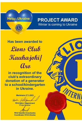 Klubimme on jo joku aika sitten lahjoittanut Ukrainaan 800 euron arvoisen aggregaatin. (Samoin teki LC Päntäne.)