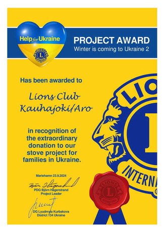 Klubimme lahjoitti 1118 USD. Kuvassa on kampanjan puheenjohtajan ja Ukrainan piirikuvernöörin allekirjoittama kunniakirja.